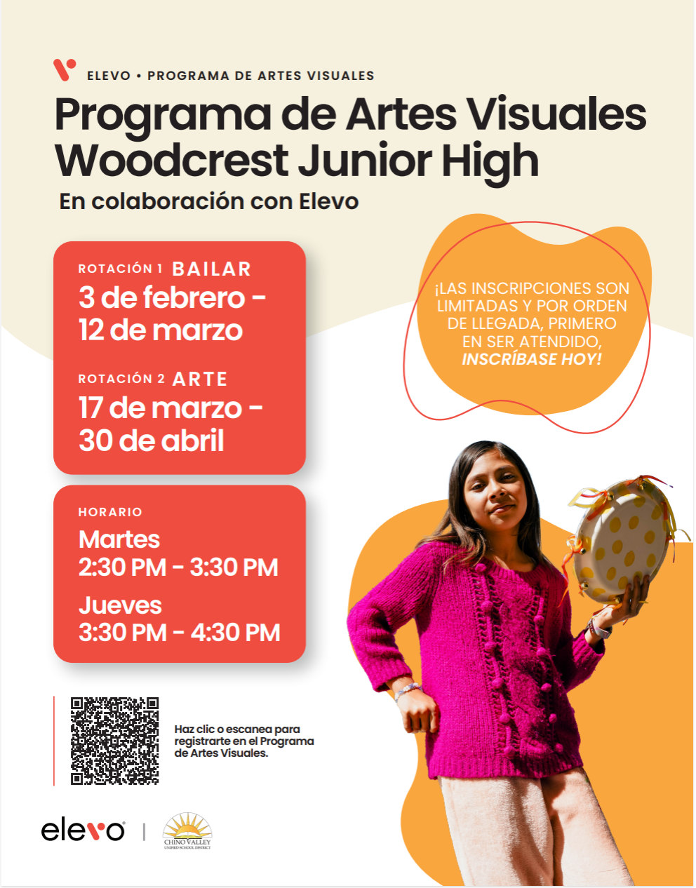 Woodcrest will be offering after-school visual arts programs in partnership with Elevo. This is at no cost to our families. There is limited space. Please scan the QR code to sign up and register. Classes begin next week on Tuesday, Feb. 3rd.